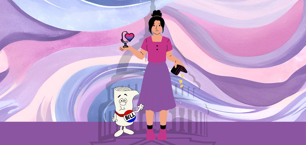 I’m going as a bi+ community organizer. As someone whose work has grown from love, curiosity, spite, research, and humor. As someone who believes bisexual visibility belongs in national spaces, and knows firsthand why it matters.